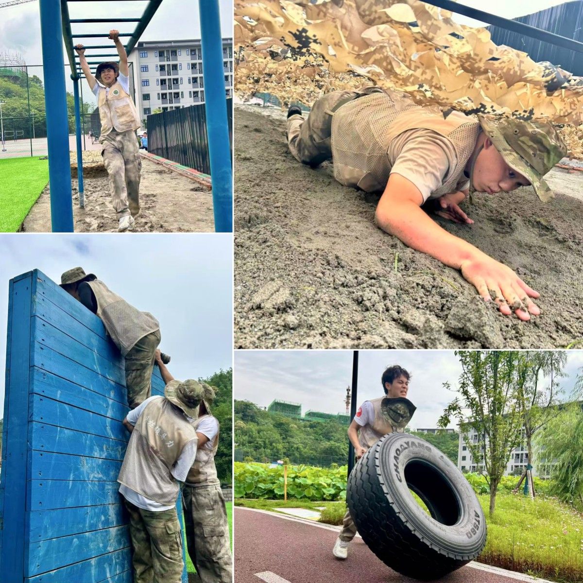 泥沙瞬间糊满手臂,李洋将自己“砸”进战术低姿匍匐区,细沙硌得生疼。刚钻出低桩网,冰冷的云梯攀至半空而无处借力,阵阵眩晕让她指尖发白。翻越高板时队友的奋力托举,让他第一次感受到团队的力量如此强大。子师湖畔,百公斤战狼轮胎抱上去时纹路扎得掌心发麻。他肩抵冰冷橡胶,榨出低吼翻动轮胎。汗如雨下,手臂欲裂,第一次如此清晰地听见心脏擂击胸膛,也第一次确信:这副身躯蕴藏的韧性,远超想象。