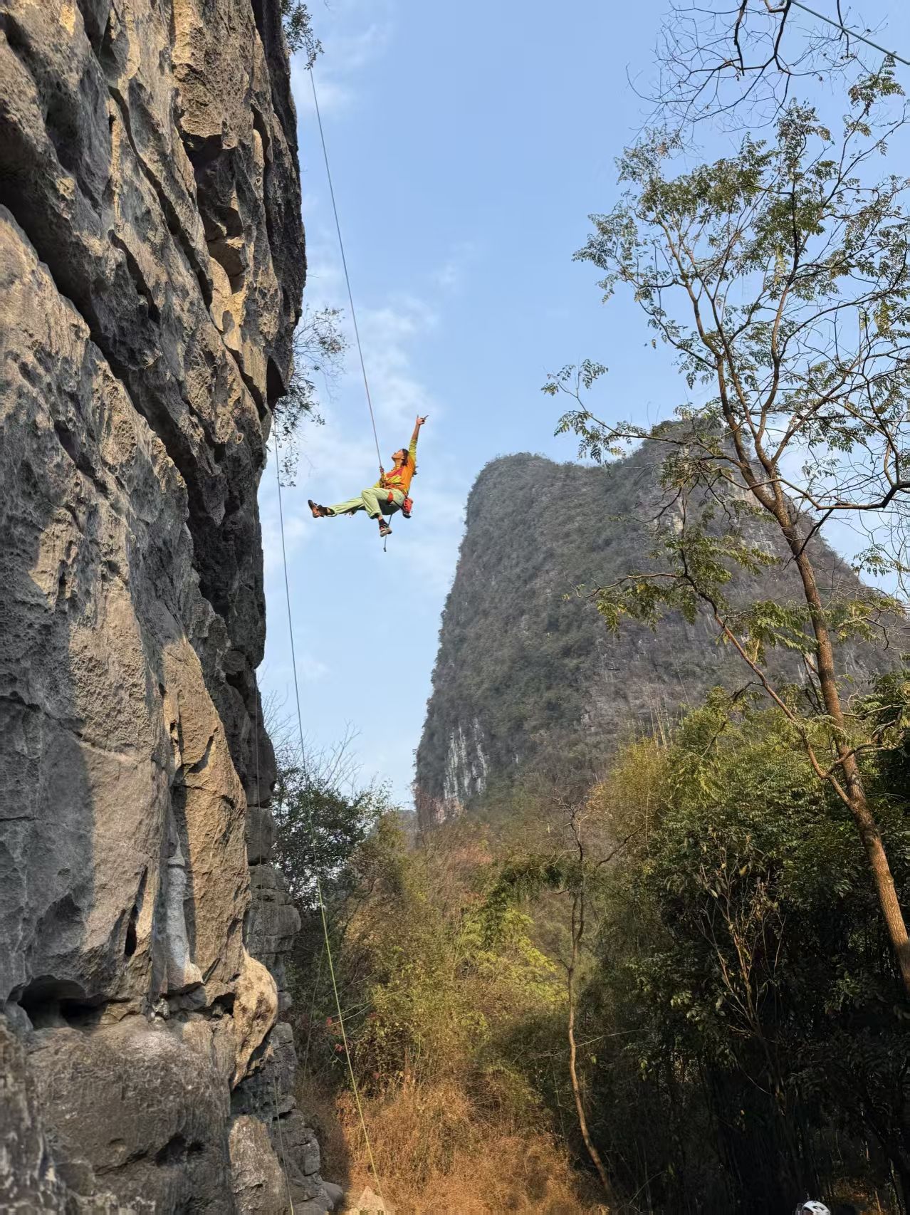 两年前的秋天,她还远在边疆担任攀岩老师,学校体育馆旁十二米高的人造岩壁就是她的“战场”。一年间,她承担了3个班的《体育与健康》课程、20个班的常规《攀岩》课程及百余节社团课,累计教授学生超800名。尽管教学任务繁重,她却始终满怀热忱。每当阳光切入场馆,便是她的满足时刻。“岩点如同戈壁滩上散落的宝石,因热爱而明亮。”她回忆道,“看着孩子们发光的眼睛,映着光影、口号与汗水,每个瞬间都令人热泪盈眶。我盼他们如鲤鱼跃龙门,登上自己的顶峰;我愿为桥,引领他们走向新世界。”