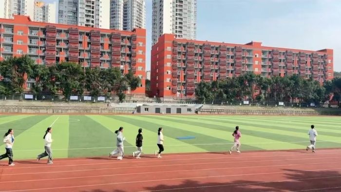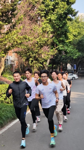 随着新学期的到来,我校铁人三项队迅速进入了紧张而有序的训练状态。校男子铁人三项队在李游、黄静两位教练的带领下正有序推进有规划的恢复性训练,旨在助力队员们尽快恢复至最佳状态。主要以有氧跑+身体素质训练为主,有氧跑步训练时长为 40 分钟,部分队员因尚未完全适应训练强度,跑步时身体姿态出现偏差,但在教练的精准指导下,逐步得以纠正。在跑步训练中,当有队员体力不支时,队友们相互鼓励、携手共进,确保无人掉队。