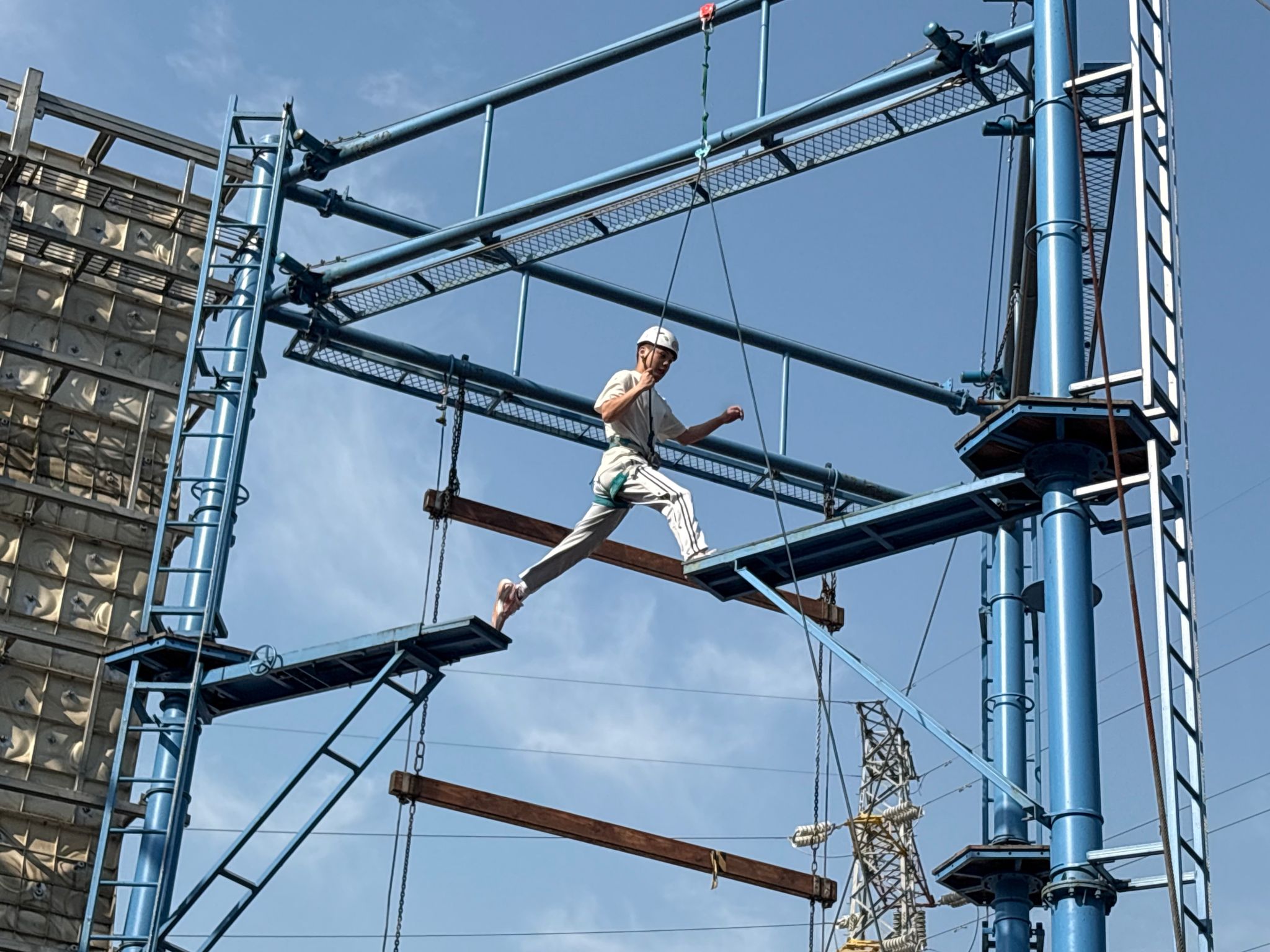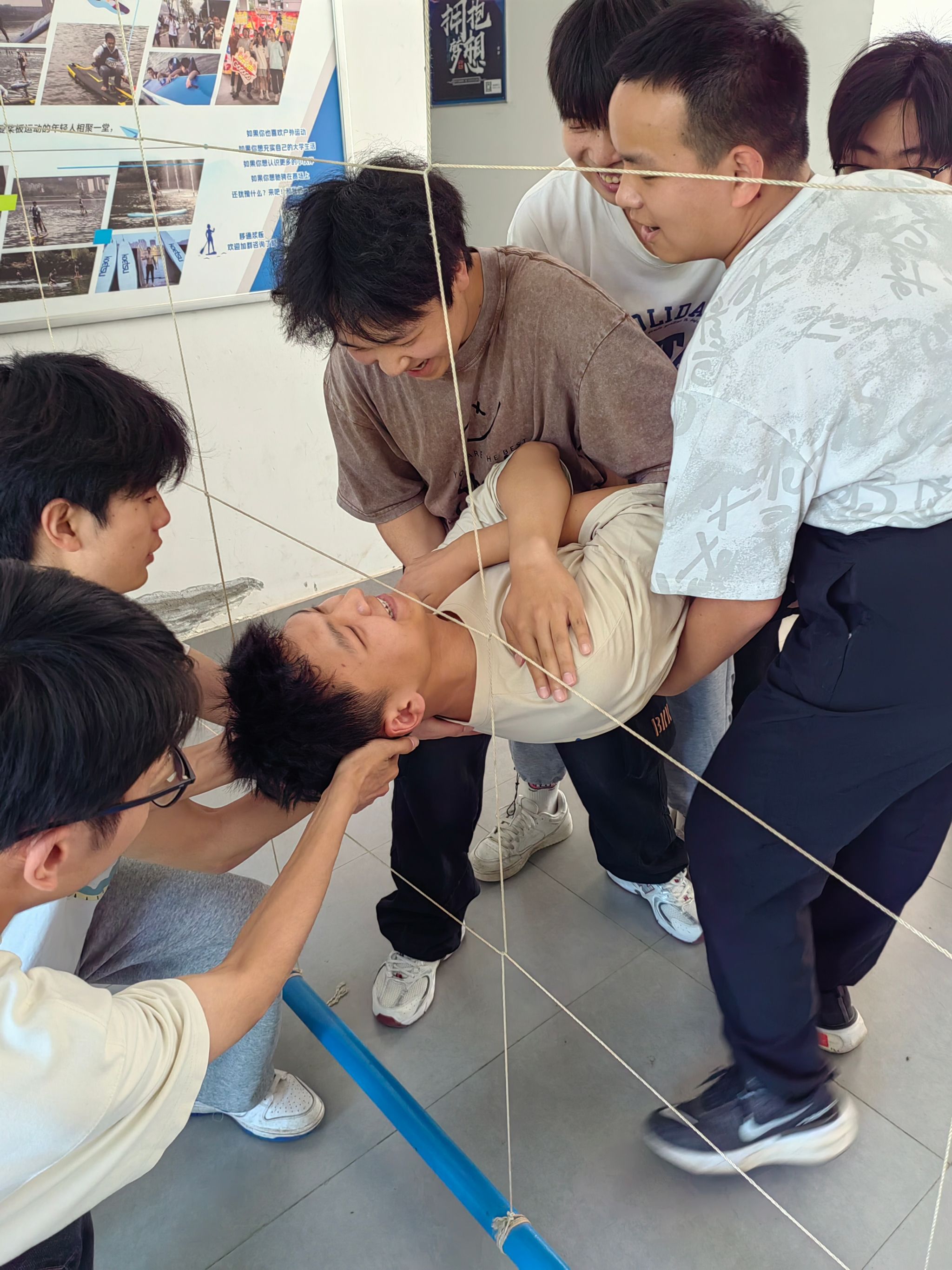 当八米高的空中断桥横亘眼前,平日实验室里摆弄电路板的手掌沁出了汗水。每位同学在队友们“我们相信你”的呐喊中完成纵身一跃,有的落地时泛红的眼眶里盛满自豪。而在“穿越电网”这一难关中,男生们用坚实的臂膀筑起人桥,女生精准计算着每个穿越角度,当最后一人安全落地,夕阳将相拥的身影拉得很长很长。