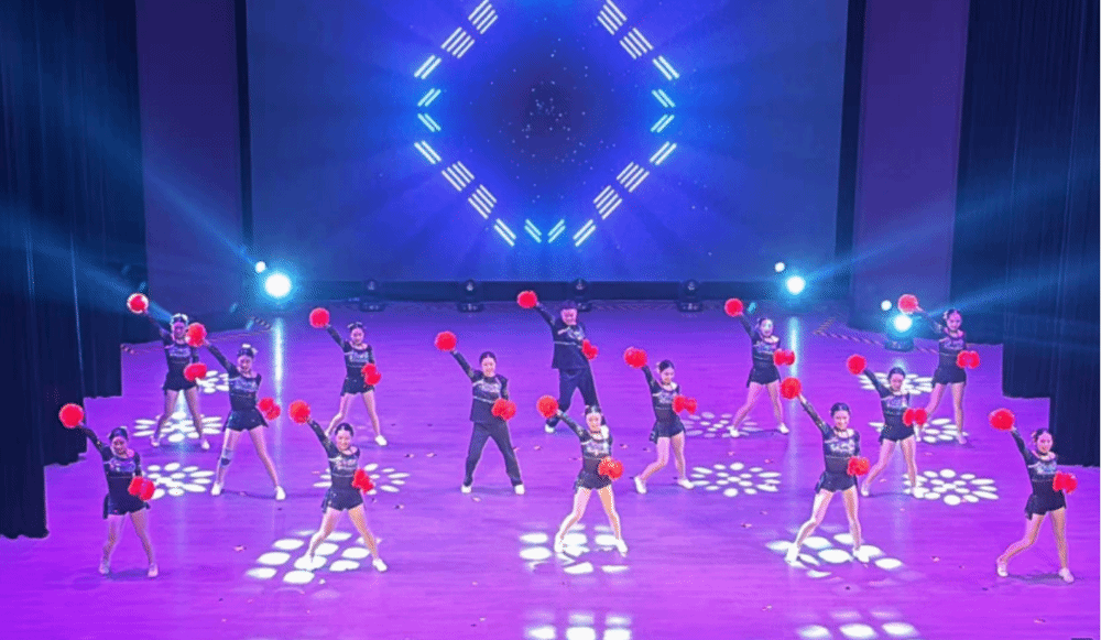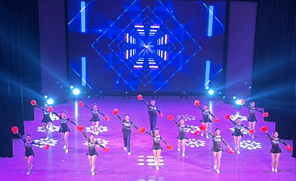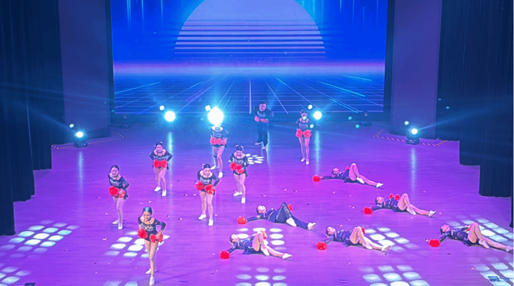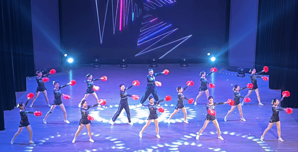随着音乐的骤然响起,一群身着鲜艳服装、充满活力的啦啦操队员跃上舞台,她们动作整齐划一,节奏感十足,仿佛将红岩精神的坚韧与不屈化作了舞动的旋律,传递着青春的力量与激情!