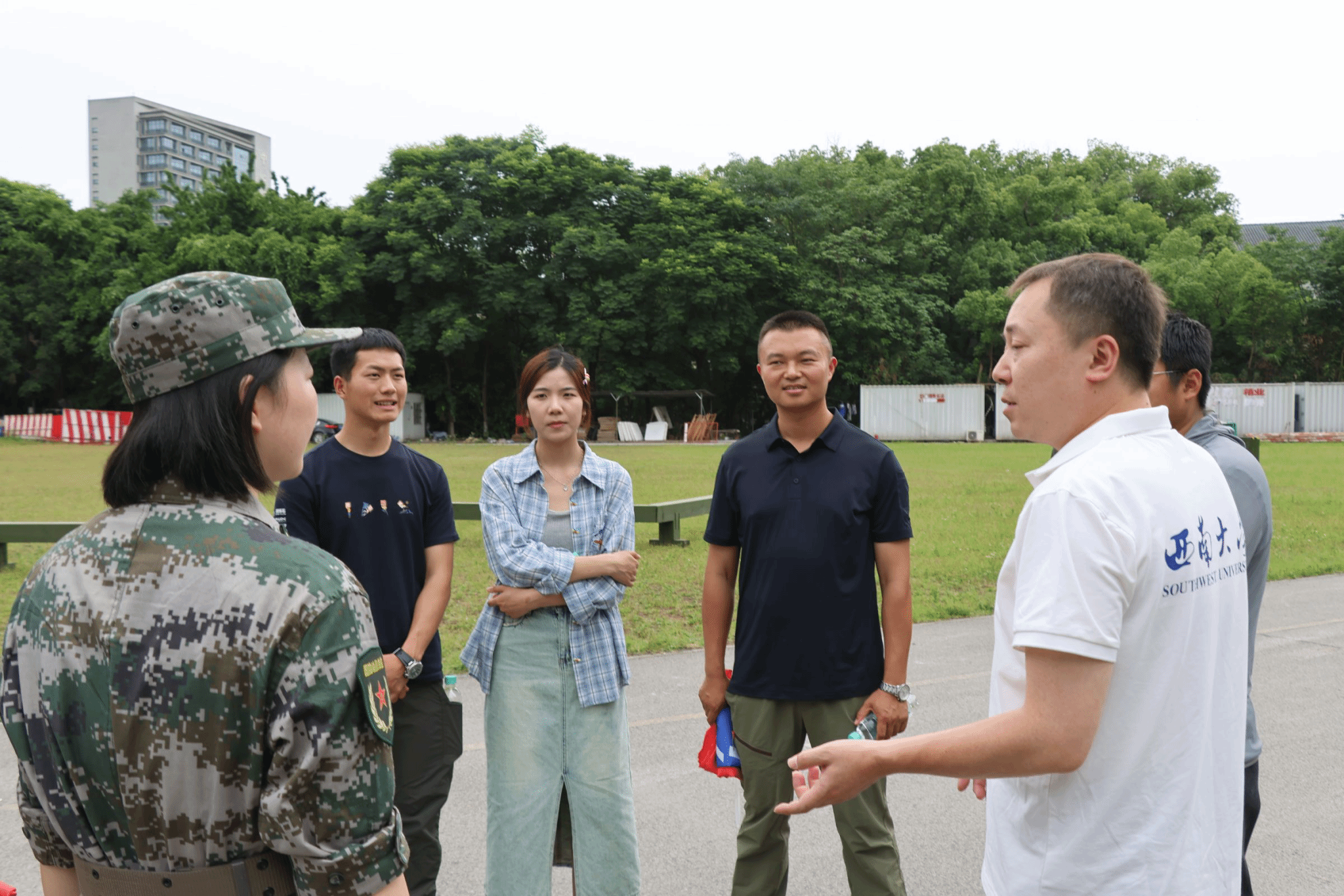 当日下午,西南大学国防教育科科长吴东倩、教师彭江带领学生女子国旗班及砺剑班全体队员热情迎接我校师生。彭江老师在欢迎致辞中表示,两校在国防教育及国防体育领域各有特色,期待通过交流碰撞出更多育人智慧。随后,我校师生跟随彭江老师走进西南大学国防教育训练基地,实地了解训练场地规划、装备配置及学生队伍管理模式。砺剑班学生教官现场展示了障碍训练操作及装备使用技巧,并详细讲解动作要领。我校师生认真观摩、主动提问、记录要点。
