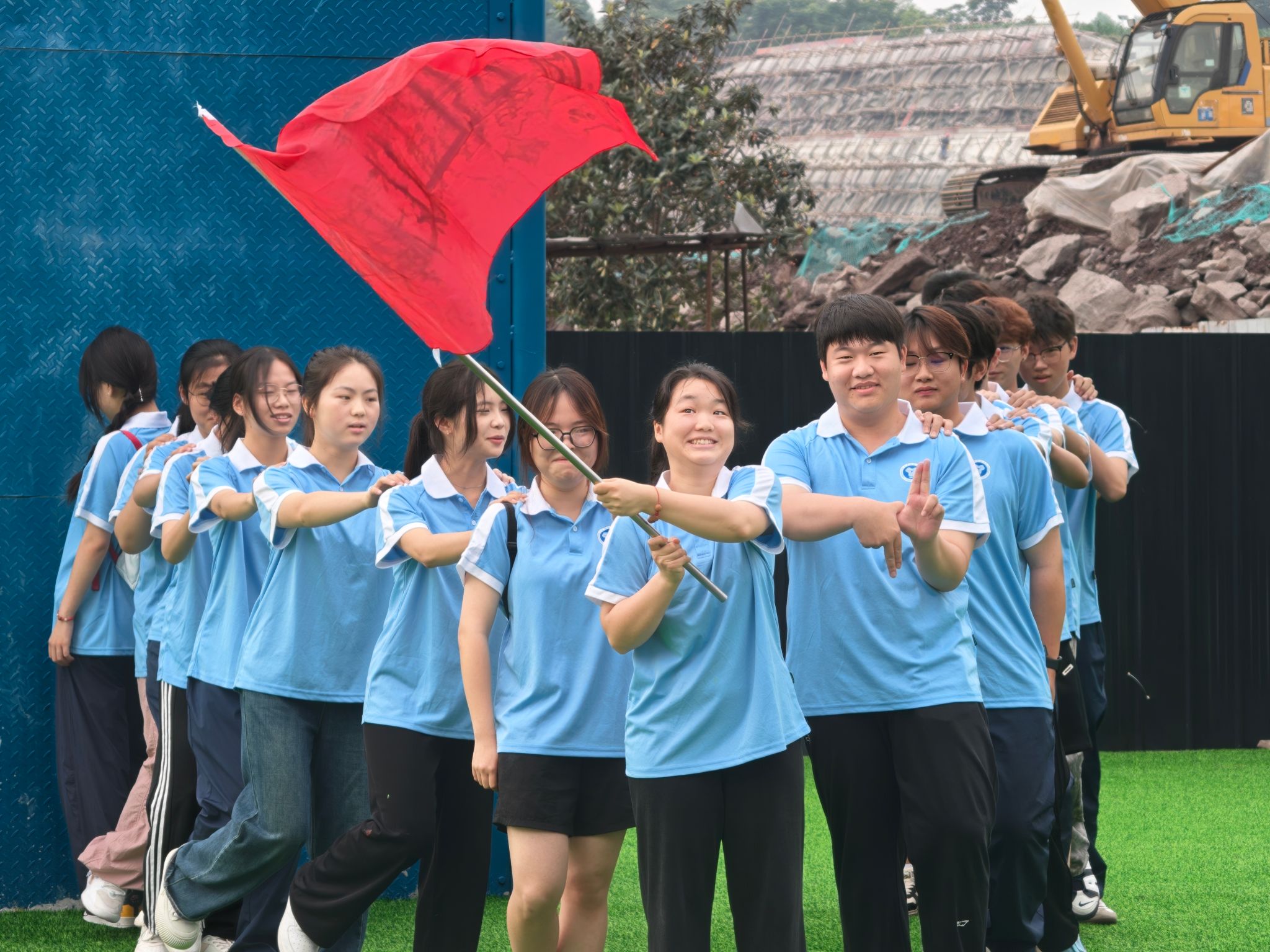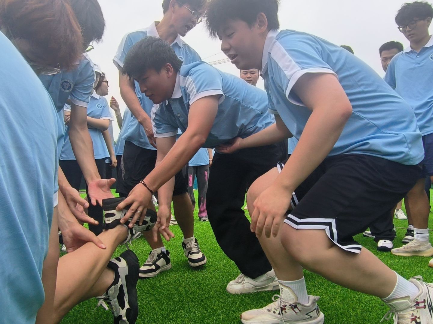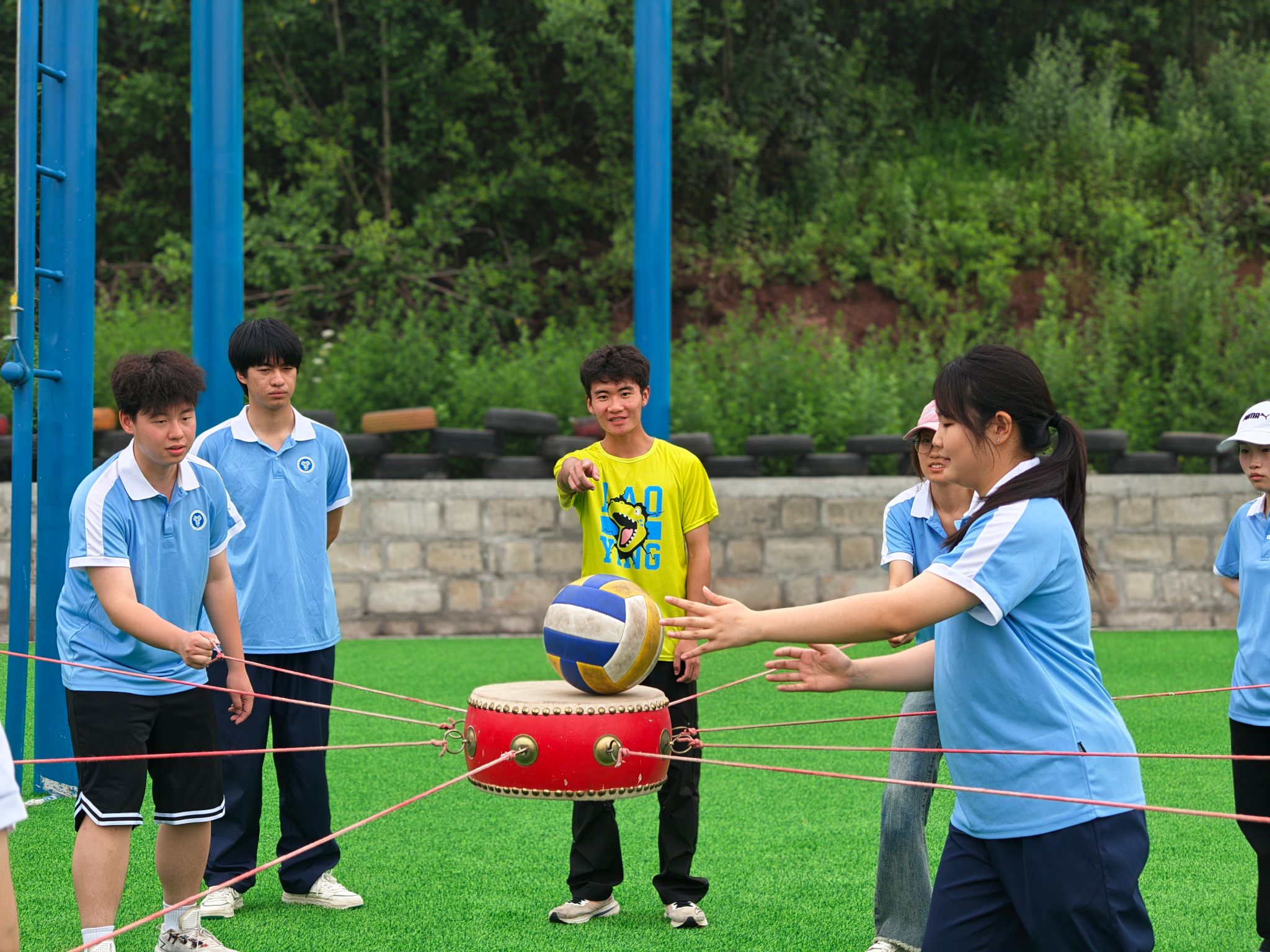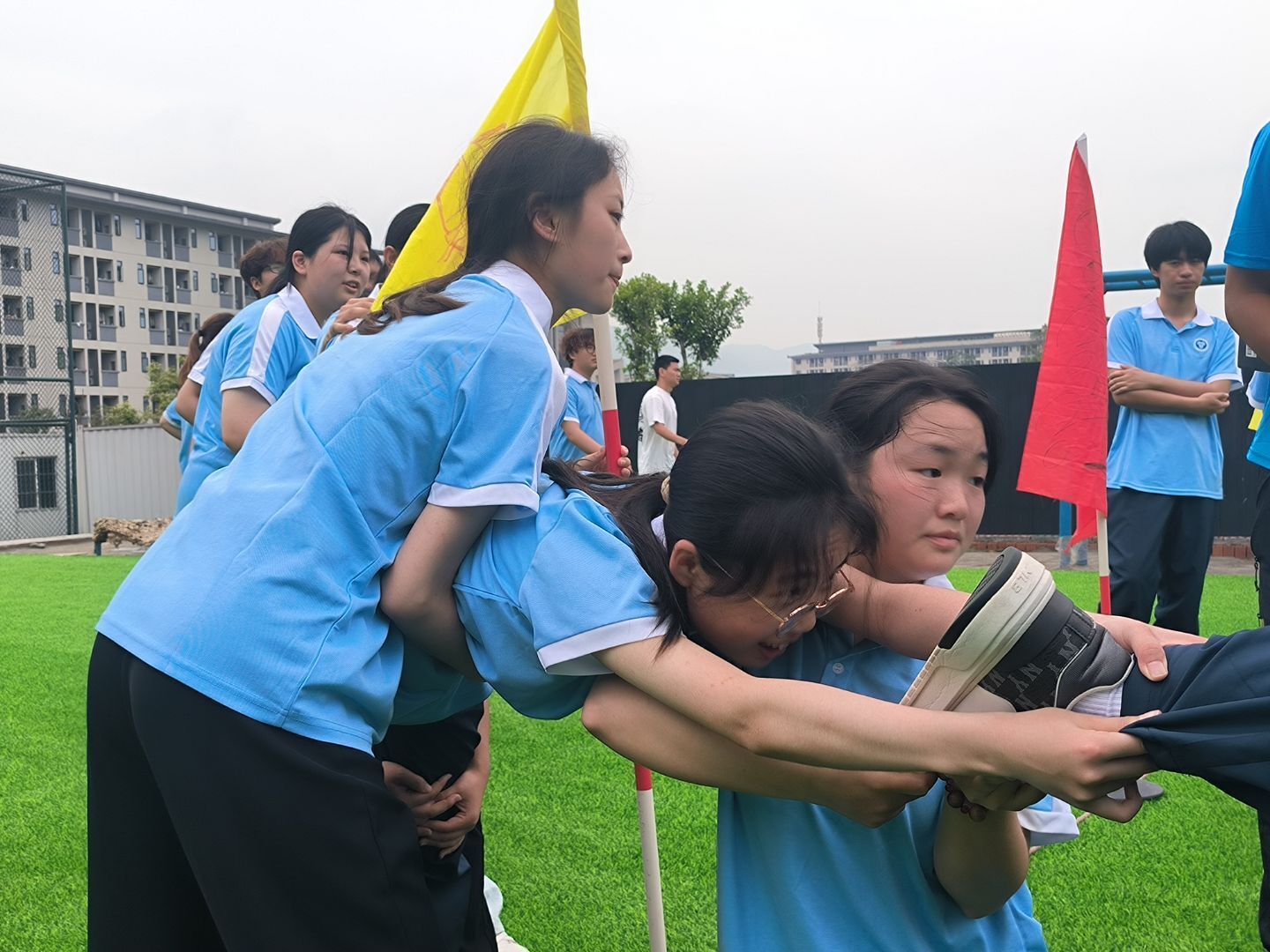 “蛟龙出海”项目中,二十一人绑腿化作一条“陆地蛟龙”,口号声震耳欲聋:“一二!一二!”看似简单的齐步走,实则暗藏玄机——有人负责喊节奏,有人充当“方向舵”,有人默默调整步幅。起初跌跌撞撞如同“醉汉行军”,但在一次次磨合中,队伍竟跑出了风驰电掣的气势!大家深刻意识到了团队写协作的重要性,互相搀扶着一步步走向终点,在触摸到队旗的一瞬间宣告本次的胜利。