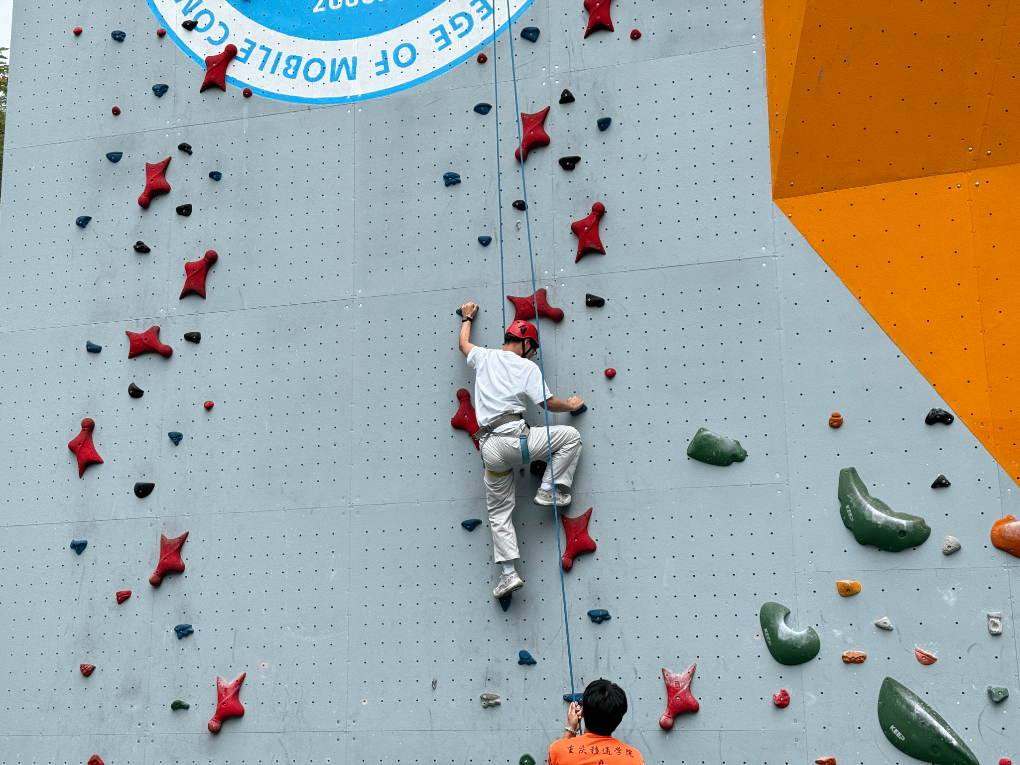 十二米的墙壁上镶嵌着五颜六色的彩色支点,岩壁化作巨型立体棋盘,专业教练化身“闯关导师”,把知识技巧编成“岩壁密语”:“手指像钩子一样勾住岩点,脚像小壁虎踩稳支点!”同学们系上安全绳,从试探性的指尖触碰,到咬紧牙关跨越“难点关卡”,每一次上升都是与自我的博弈。当恐高的队友的呐喊声中抓住顶峰岩点,岩壁下瞬间沸腾:“这波逆风翻盘太绝了!”