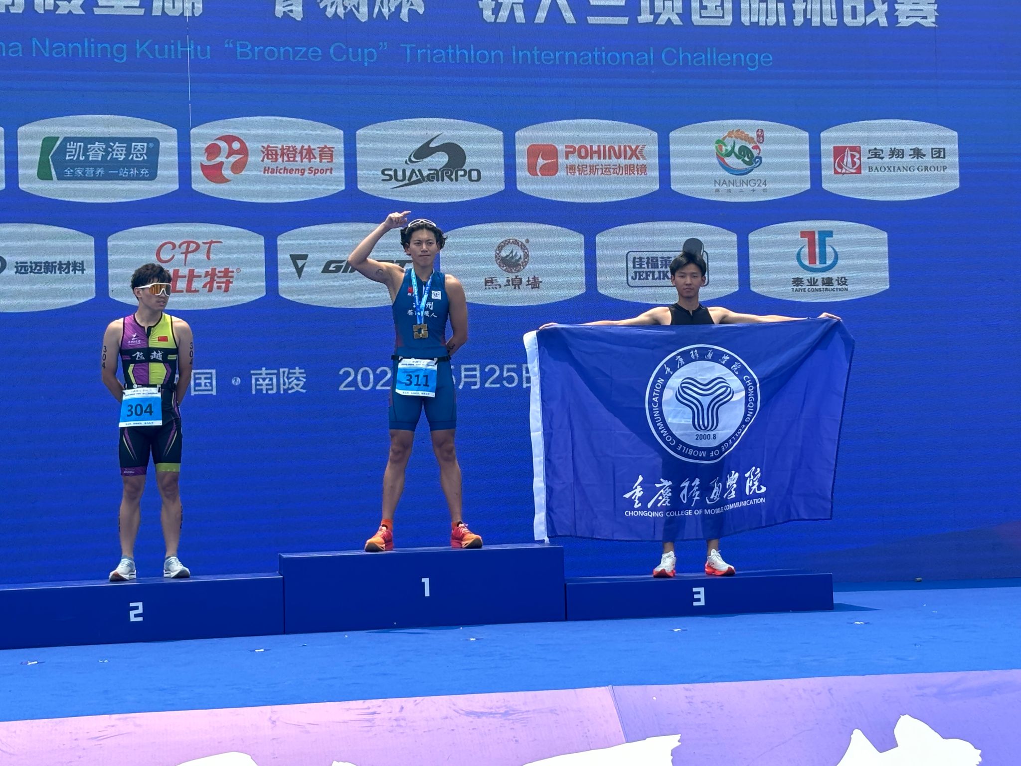 2025年5月25日,安徽芜湖南陵奎湖畔人声鼎沸,由中国铁人三项运动协会主办的2025南陵奎湖“青铜杯”铁人三项国际挑战赛拉开帷幕。重庆移通学院铁人三项队16名队员与来自日本、法国、瑞士等国家及国内38个城市的566名顶尖运动员同台竞技,最终以1冠、1季,共13项国际前八名的辉煌战绩,在这场国际A级赛事中强势突围,生动诠释了“最体育的非体育大学”的育人实力。
