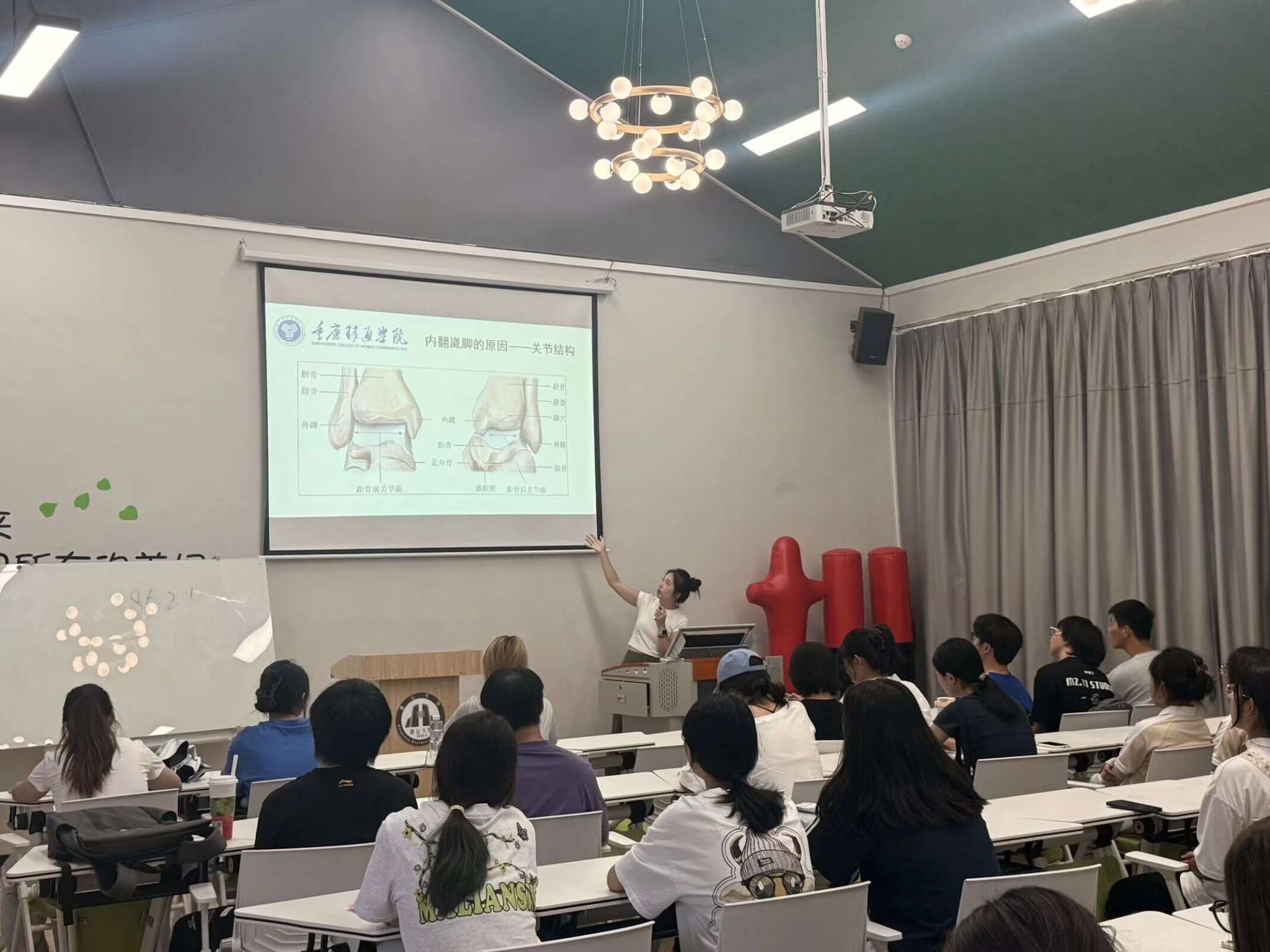 讲座伊始,齐乃琪教练结合大数据学院学生课余运动偏好,以篮球、跑步、羽毛球等高频运动项目为切入点,通过踝关节解剖动画、展示临床典型损伤案例,直观讲解了踝关节的生理结构特点,让学生快速理解“为何踝关节是运动损伤高发部位”。随后,她围绕踝关节损伤后的急性期、恢复期、功能强化期三阶段,系统拆解针对性康复方法: