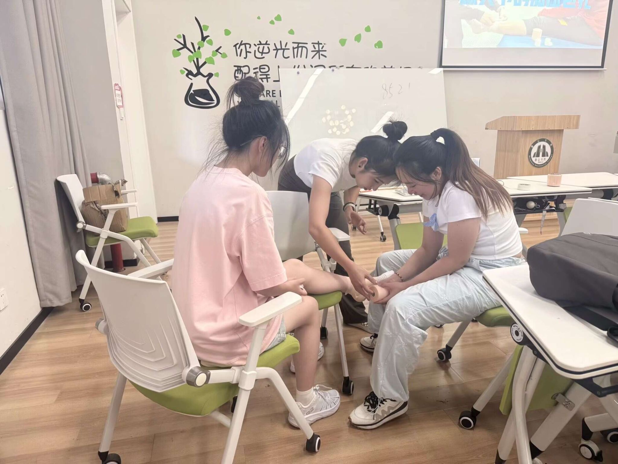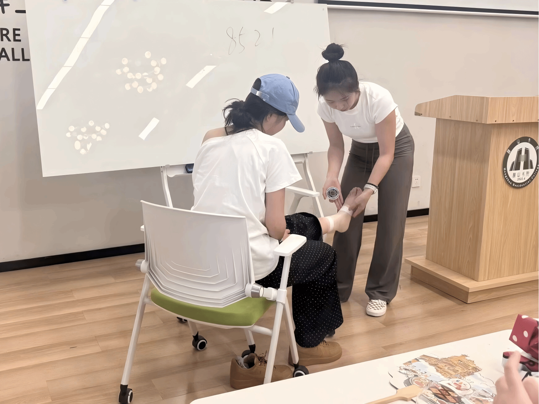 理论讲解结束后,讲座进入实操教学环节,这也是本次活动最受学生期待的环节。齐乃琪教练手持绷带,边演示边讲解踝关节加压包扎的关键步骤,从起始位置、缠绕方向到收尾固定,每个细节都清晰呈现。随后,她邀请学生上台实操,针对“缠绕过松起不到加压效果”“绷带歪斜导致关节受力不均”等问题,一对一进行手法纠正。