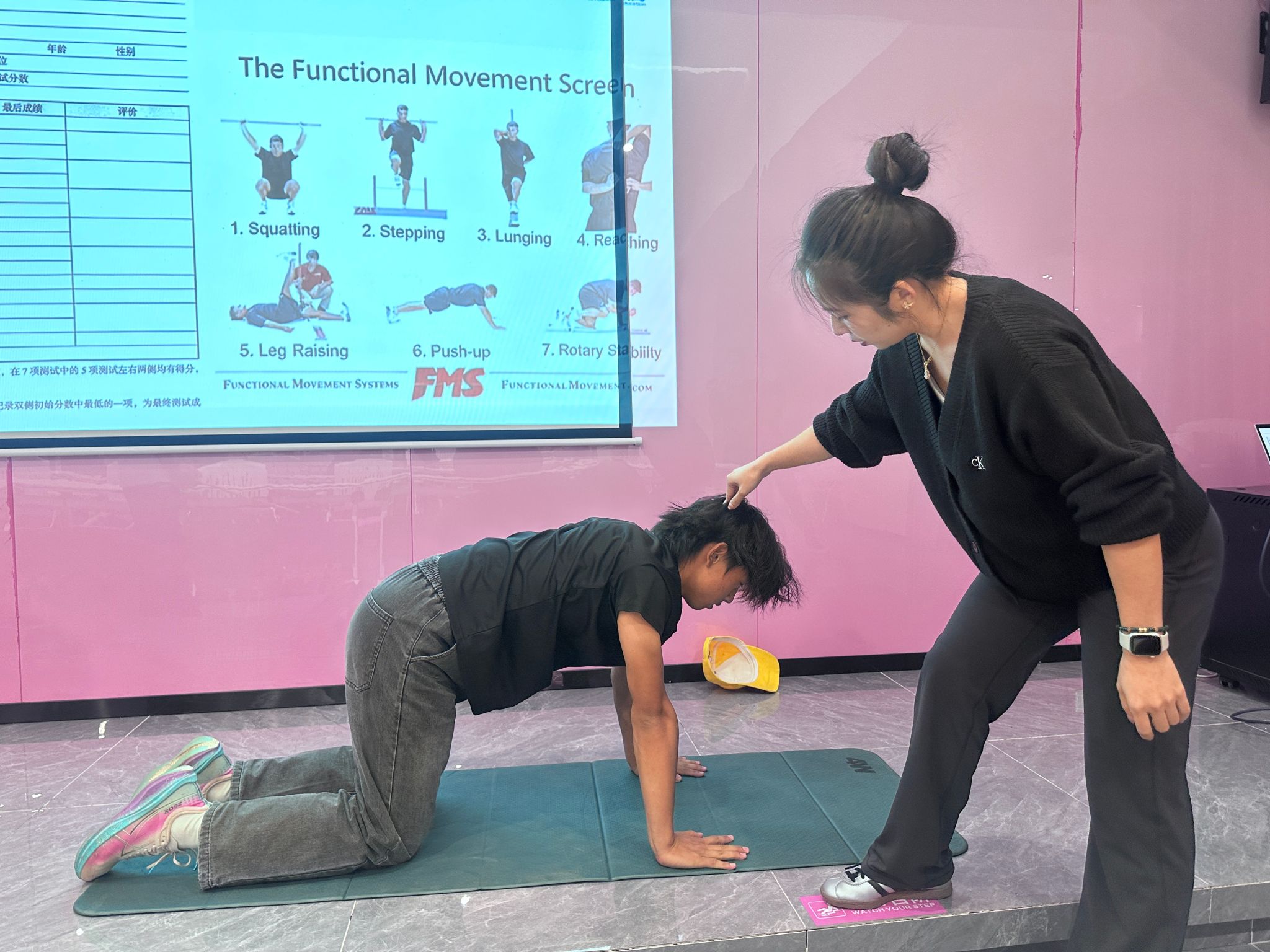 讲座后半程,“FMS功能性动作筛查”成为焦点。齐乃琪教练指出,许多运动不适的根源是“功能性动作模式偏差”,而非“能力不足”。她详细介绍了FMS的三大逻辑——“先看动作模式再看力量”“筛查≠诊断”“不对称是损伤预警”,并现场示范深蹲、跨栏步、弓箭步等7个FMS基础动作,指导师生通过“观察代偿动作”发现身体隐性障碍。在互动环节,师生两人一组互相筛查,亲身体验如何用“零门槛”工具评估自身运动风险,现场学习氛围浓厚。