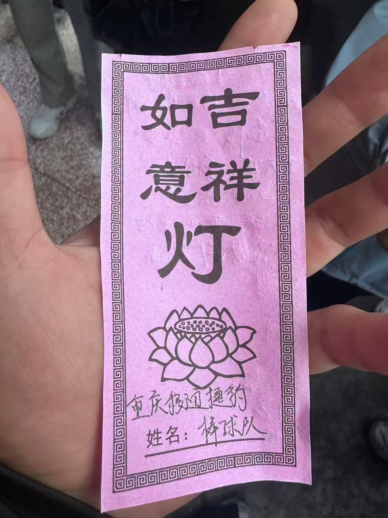 在观内,教练杨林早已等候多时。他手持一盏精美的吉祥如意灯,为棒球队举行了简短的祈福仪式。这盏灯不仅是体育精神的象征,更寄托了大家对学业、健康与团队发展的美好祝愿。杨林教练说:“棒垒球运动与修行一样,都需要持之以恒的毅力,希望同学们能将赛场上的拼搏精神延续到生活中。”