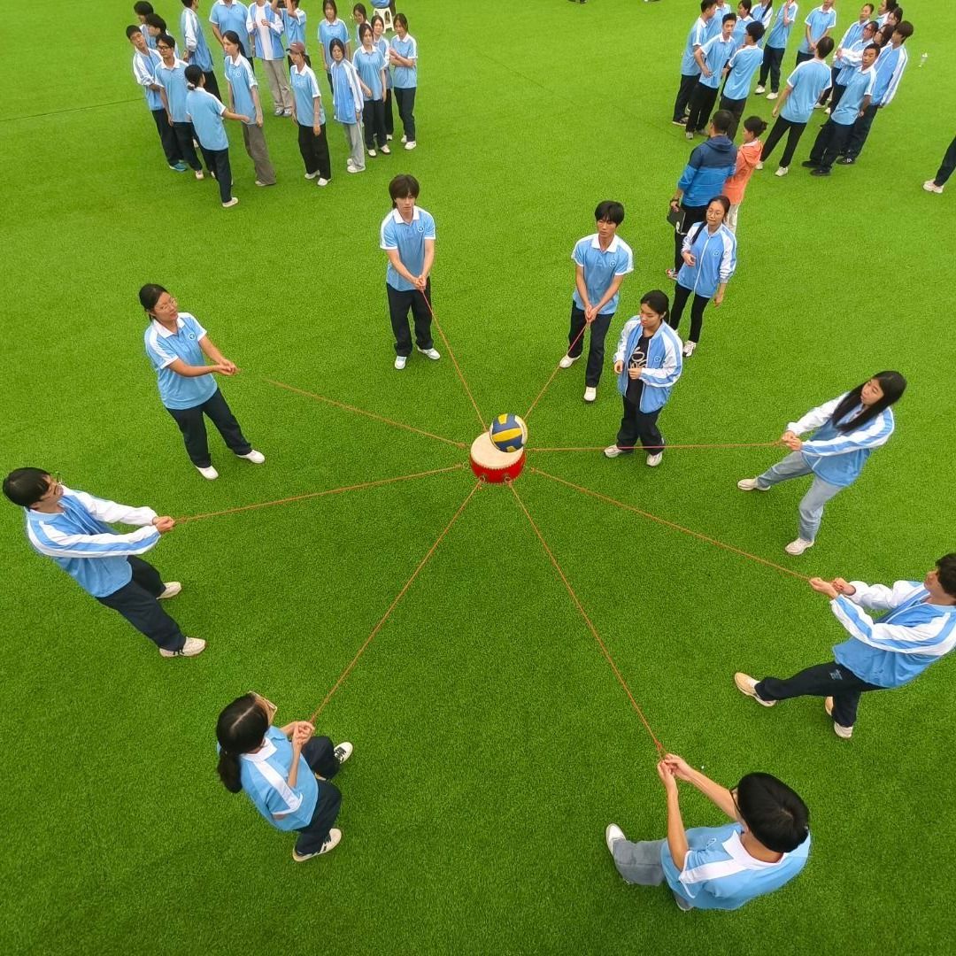 鼓动人心:成员们紧握鼓绳、共控鼓面平衡,齐心协力让小球持续弹跳。从最初的杂乱无章,到逐步找到节奏、实现动作统一,大家在反复尝试与调整中,领悟“统一节奏、凝心聚力”的协作精髓,现场欢呼声与鼓点声交织,奏响青春协作的动人旋律。