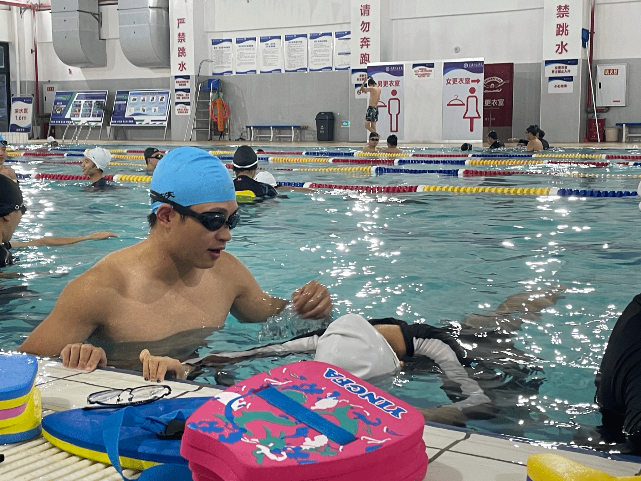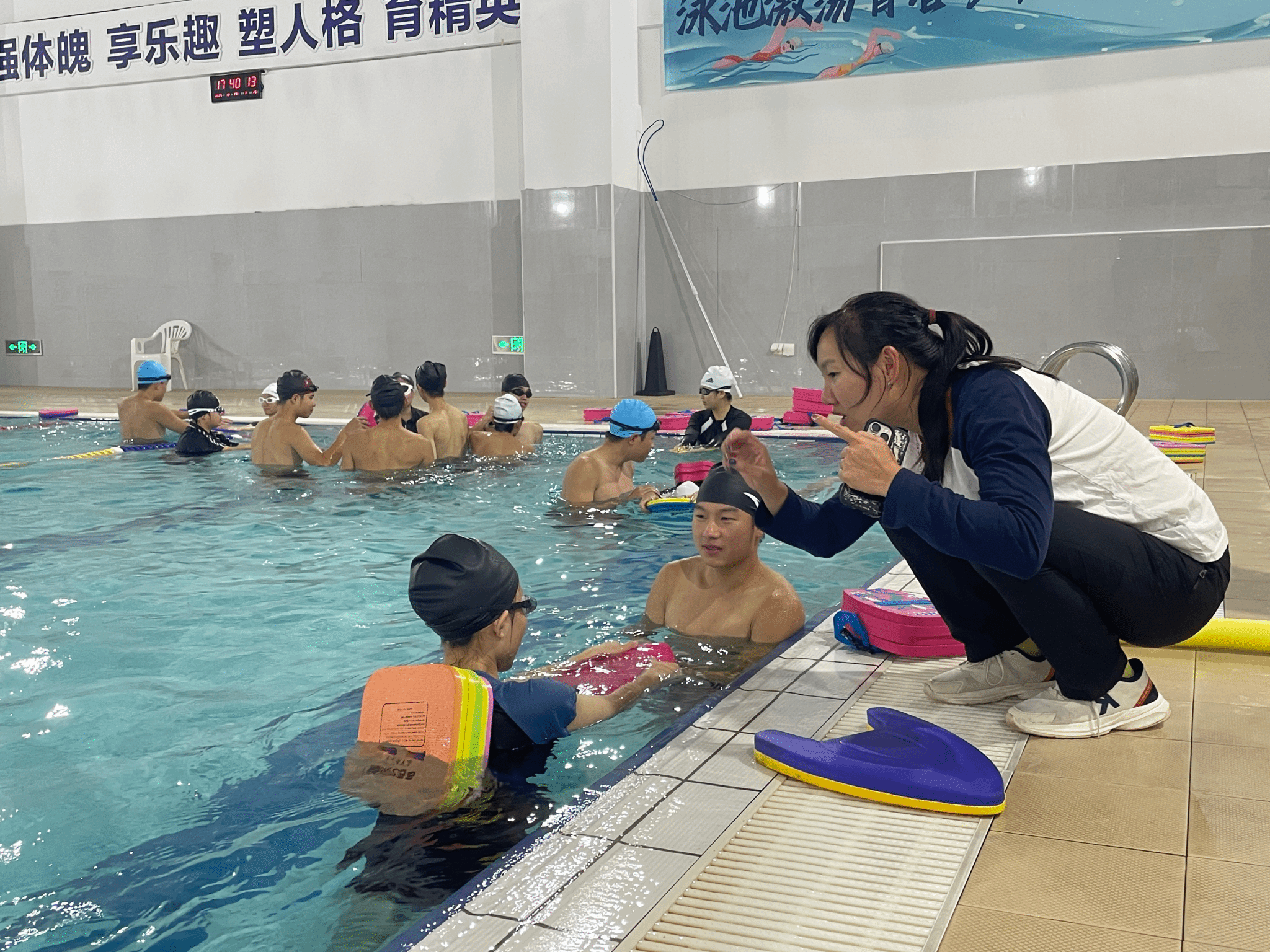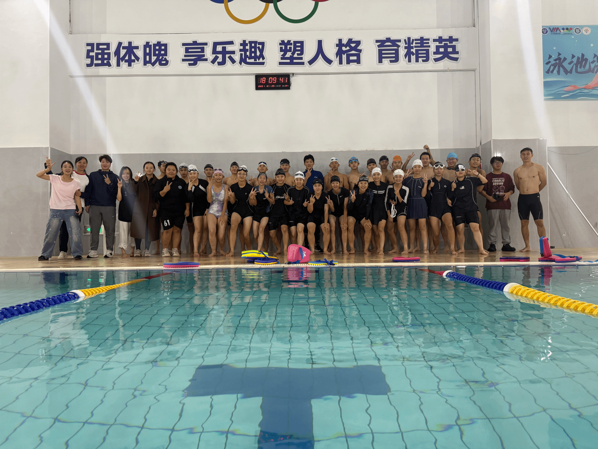 接下来的环节将这次活动推向了高潮。全体人员转场至游泳馆内,活动进入游泳教学阶段。铁三队员接过 “教学接力棒”,带领女足队员开展游泳训练,他们展现出专业优势,从呼吸节奏的调整到划水效率的提升,手把手指导女足队员攻克游泳技术难点,帮助她们在陌生的水域中逐渐找到平衡与自信,突破体能与技能的双重边界。部分女足队员起初对深水存在顾虑,铁三队员通过陪伴式练习、鼓励式指导,帮助她们克服心理障碍,逐步在水中找到平衡与节奏,泳池内溅起的水花成为跨界交流的生动注脚。