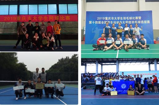 5月,在“2019年重庆市大学生羽毛球比赛暨第十四届全国学生运动会大学组羽毛球选拔赛”中,我校荣获甲组团体总分第三名的成绩,其中孔德辰荣获甲组男子单打冠军;孔德辰、何勇荣获甲组男子双打冠军,比赛成绩取得历史性突破。同月,在“2019重庆市大学生田径锦标赛”中,我校田径运动队在70余所高校较量中,突破历时获得男子、女子团体第三名的成绩。11月,在“2019重庆市大学生网球比赛”中,夺得团体第六名。黄鹏在男子单打比赛中,表现抢眼稳定发挥,最终夺得单打第三名,实现历史性突破。