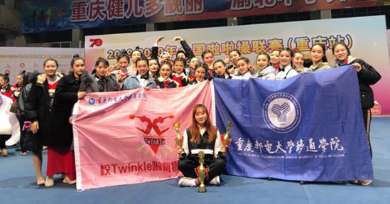 11月,我校Twinkle啦啦操队在2019-2020年全国啦啦操联赛(重庆渝北站)中,收获第一名获得代表中国参加2020年国际啦啦操赛事的资格;在国家体育总局体操运动管理中心主办的2019年福摩杯“舞动中国-排舞联赛”总决赛中获得高校普通院校团体总分第四名的成绩。学校获得“全国啦啦操星级俱乐部”、“2019年度阳光排舞进校园星级示范学校”称号。