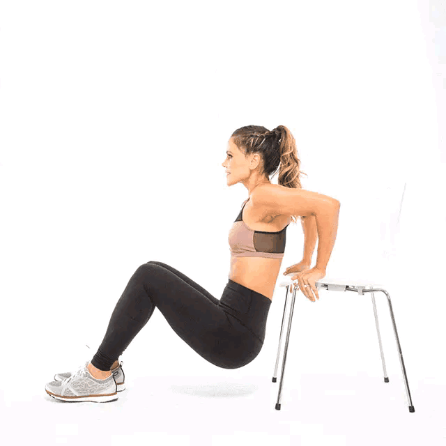 背对凳子,双臂向后,双手支撑在凳子边缘,挺胸收腹,肩部下沉,双腿屈膝,双脚踩地保持身体直立,双臂屈肘向下,至动作顶点稍停后伸直手臂还原