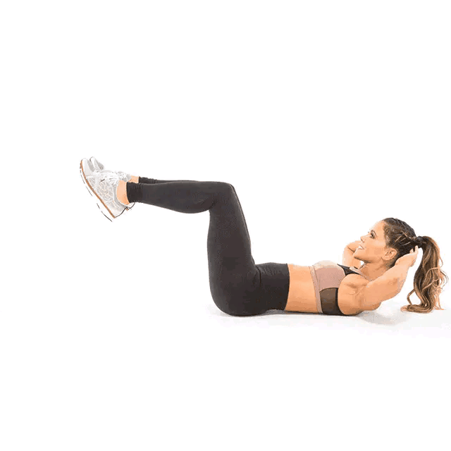 仰卧,背部贴地,双手置于耳旁,双腿并拢向前伸直,双脚离地保持下背部贴地,向前提膝抬起一条腿,同时转动双肩向对侧转体,使手肘与膝盖尽可能靠近
