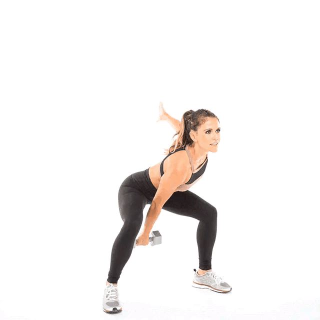 双脚打开约1.5倍肩宽,腰背部挺直,核心收紧,一只手握住哑铃置于体前臀部向后坐屈膝下蹲,同时哑铃下落到胯下,然后臀部发力向前顶起,让手臂自然前摆动至胸前,并将哑铃交给另一只手