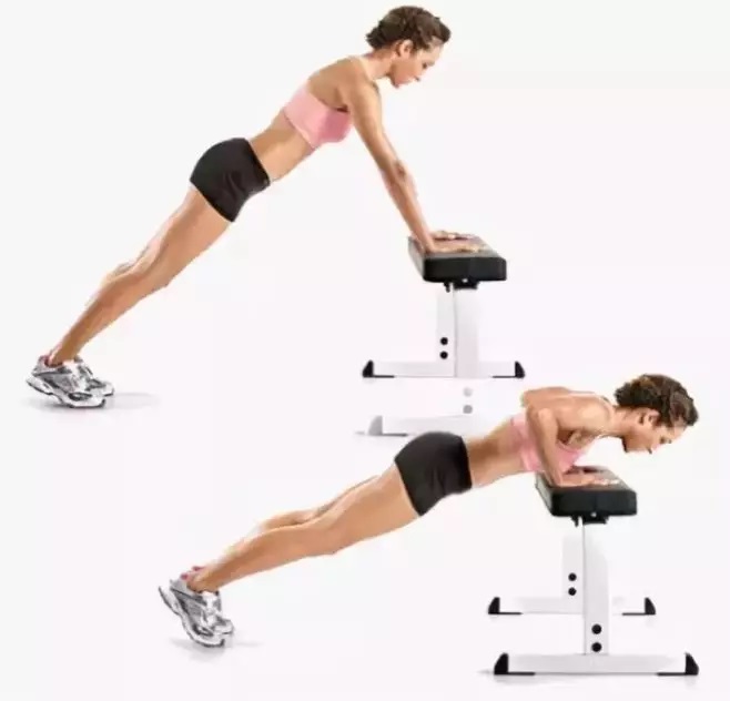 动作要领:双手扶桌,保持稳定,两前臂同身体夹角尽量呈 90 度,双脚并拢;胸部下压靠近桌子,再用力撑起还原。