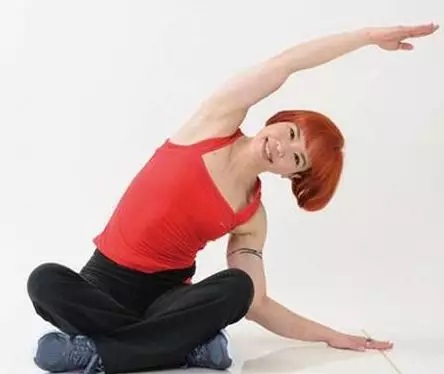 动作要领:坐于椅上,双脚自然分开,腰背直立;右手置于左大腿外侧,左手上举,身体向右弯曲,掌心朝下,肘尽量伸直,保持5~10 秒;左右交替完成一次动作。
