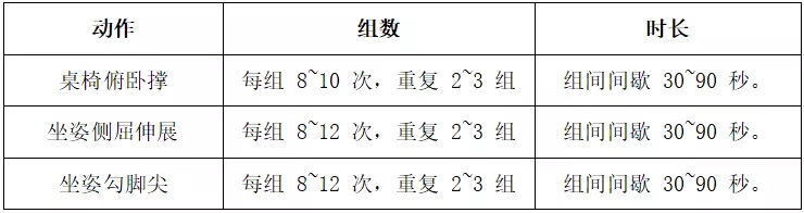 动作训练:每组 8~12 次,重复 2~3 组,组间间歇 30~90 秒。