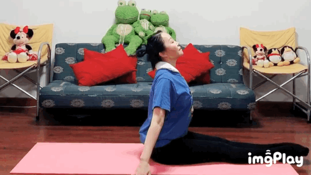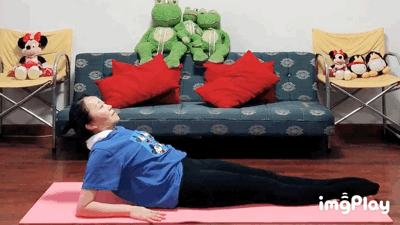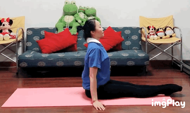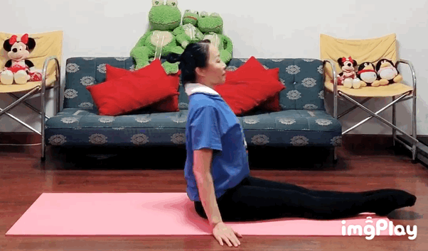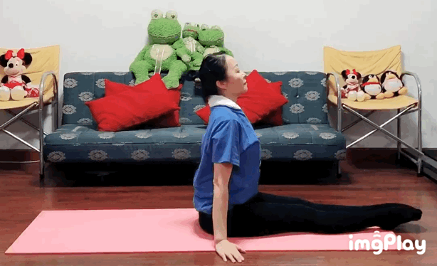 动作说明:1-4拍双腿弯曲脚尖点地,双手触脚踝,同时上体含胸弓背颈部前屈;5-8拍双腿伸直成直角坐,同时双手触地于体侧。