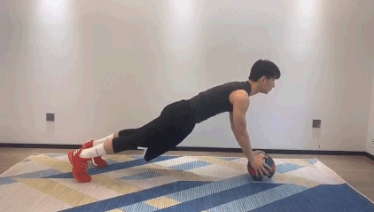 要求:双手伸直按住球做俯卧撑地动作,身体躯干和腿步伸直,形成一条直线。