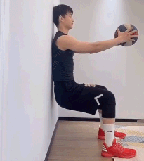 要求:后背靠住墙面,屈膝尽可能接近90度,双手持球手臂向前伸直。