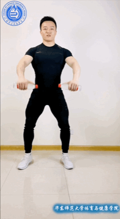 该动作可以刺激三角肌前束,肘部微屈,沉肩,吐气向上,可以借助瓶装矿泉水完成前平举练习。