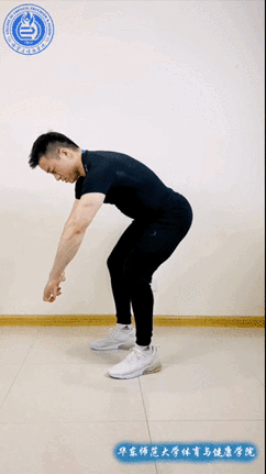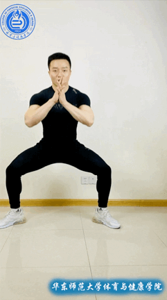 在下蹲时,先启动臀部,膝盖与脚尖的方向一致,下蹲深度可根据自身大小腿比例舒适下蹲,腰膝均无过大压力为好,下蹲吸气,起身吐气。