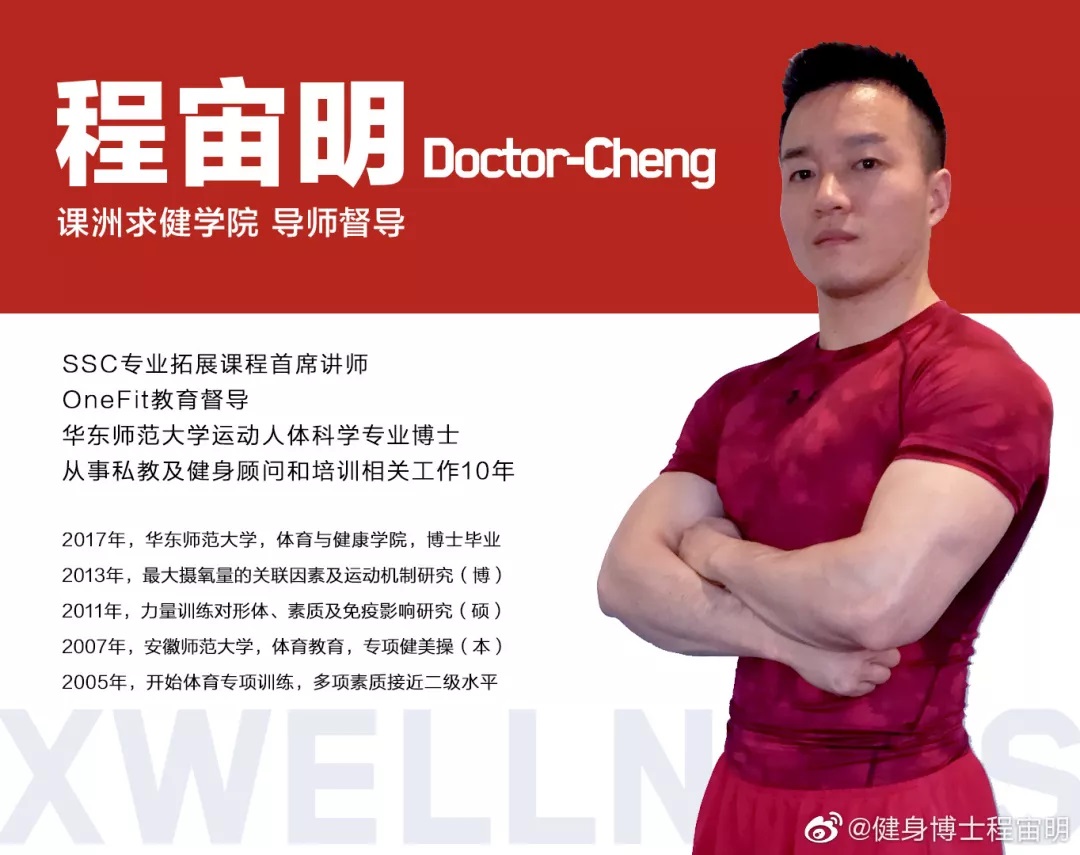 程宙明博士,2017届华东师范大学,运动人体科学专业毕业,师从卢健教授。现从事运动健身和体适能等相关研究,以及私教和私教培训工作。