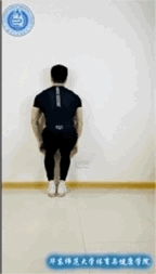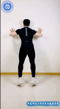 双脚并拢贴住墙,身体缓慢下蹲,保持腿部稳定性,下蹲和蹲起时全程尽量保持鼻尖、肩部和膝盖紧贴墙壁,收紧核心,脚趾抓地,该动作对腿部力量及柔韧性要求较高,可以在同伴保护下完成。