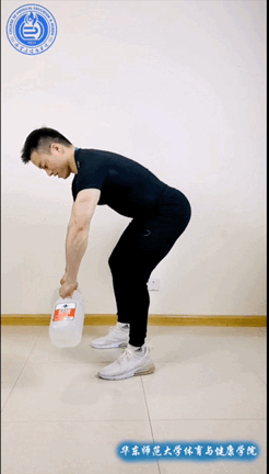 可以利用瓶装矿泉水增加负荷,更加充分的刺激背部肌群。