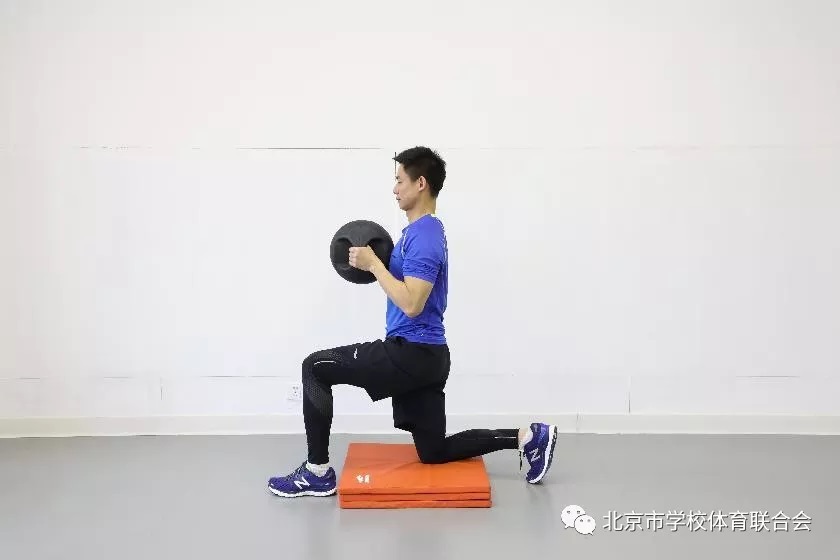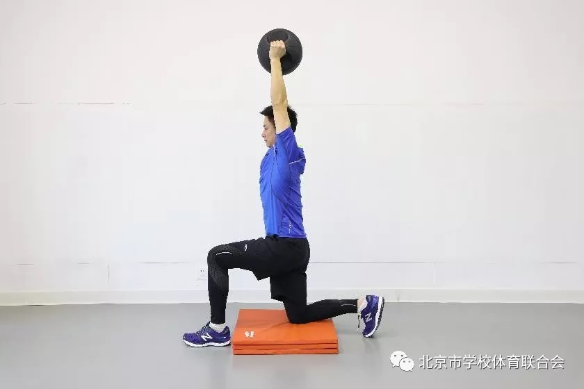 左脚在前,单膝跪姿于垫上,肘关节略微弯曲,双手持实心球于腹部,腰背收紧,双臂快速向上摆,至头顶正上方后迅速制动,缓慢的回到准备位置。可用矿泉水瓶等重物代替实心球。