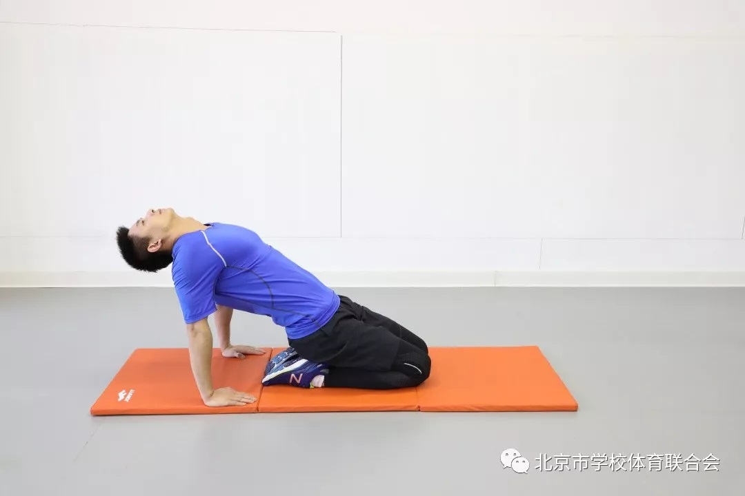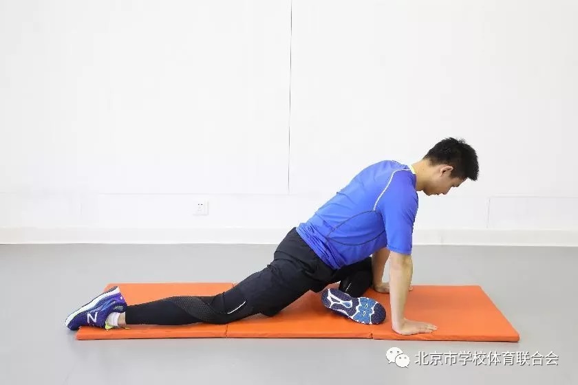 跪坐于垫上,双手后撑,躯干缓慢向后倒,直至大腿前部有较明显的拉伸感,保持姿势。