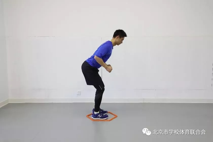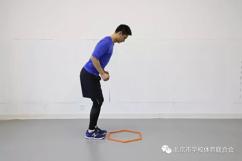 微屈膝屈髋,双脚并拢,重心稍向前,前脚掌着地,站在六边形外,逆时针方向,依次跳过每一个边,并且始终保持面朝正前方,避免踩到六边形。可在地面做简单标识代替六边形,也可假想一个六边形。