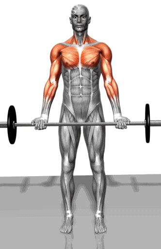 通过屈肘关节上举杠铃,至前臂贴紧上臂,下降杠铃至臂完全伸展,还原。重复上述动作。