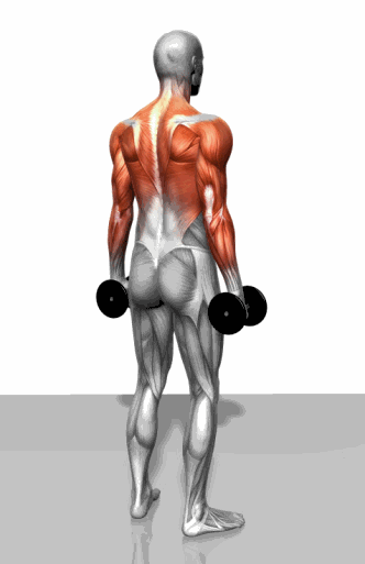 通过上提肩胛骨和锁骨上提哑铃,哑铃下降。重复上述动作。