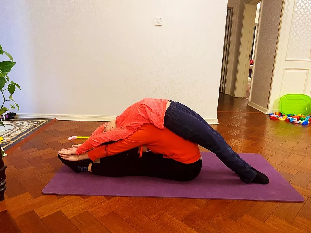 2. 游戏开始,两人背对背,一人坐在垫子上做坐位体前屈,另一人成仰卧姿势背部、臀部、肩部紧贴同伴的背部,两臂夹耳朵,双手内旋顺势放于头部前方,展体展肩。