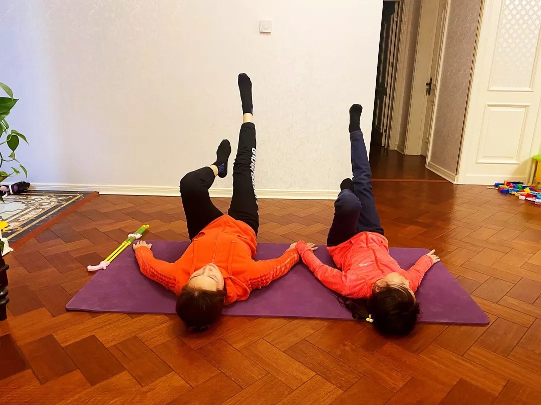 3.“相互依靠”:两人背靠背贴紧,做坐位屈体和仰卧展体动作,保持10秒钟后交换练习。“蹬小车”:两人平躺举腿,各完成10次空中“蹬车”动作。“双层支撑”:两人分上下两层俯卧支撑,在规定时间内保持动作稳定不变型。“钟摆跳”:每人轮流连续完成10次左右跳。