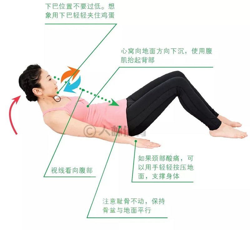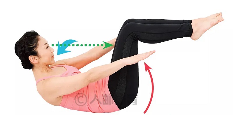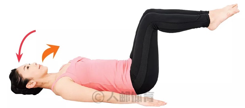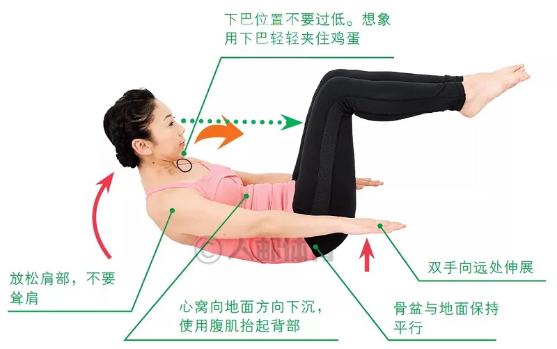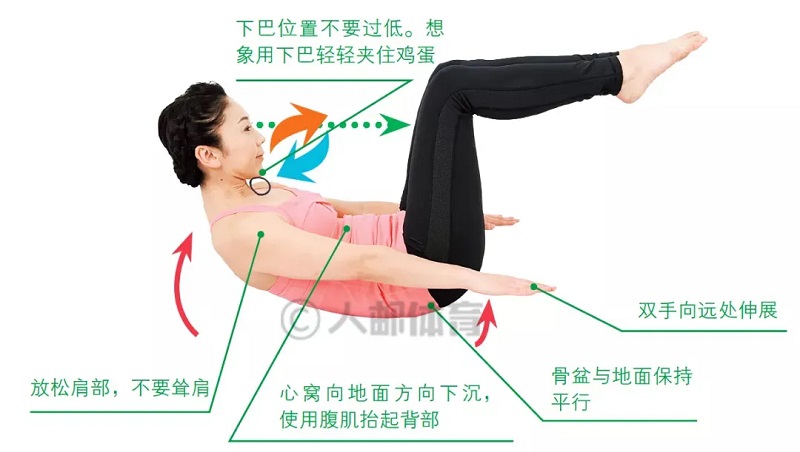呼气的同时,头顶离开地面,有意识地使用腹肌,使心窝部以上抬起。同时双臂抬起与肩同高,悬在空中。