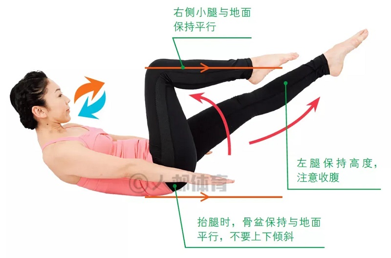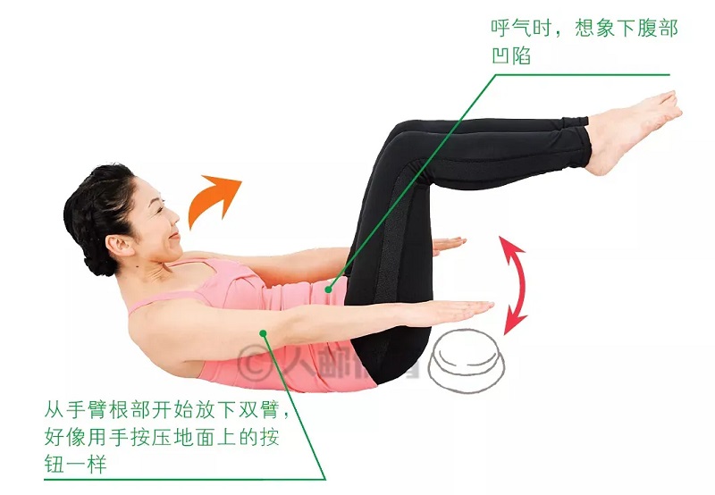 双腿和头部抬起,双手小幅度上下摆动,可以促进腹部周围的血液循环。请在有意识地运用腹肌保持骨盆与地面平行的基础上,认真练习。