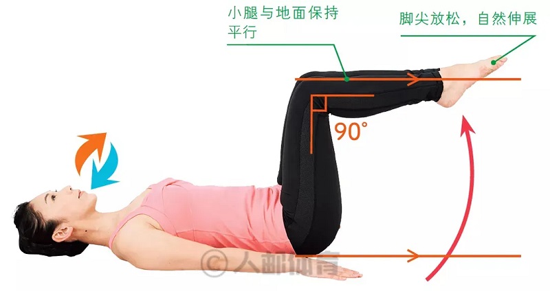 呼气的同时,右腿和左腿分别从髋关节开始抬起。膝关节弯曲呈90 度角,双腿并拢后吸气。