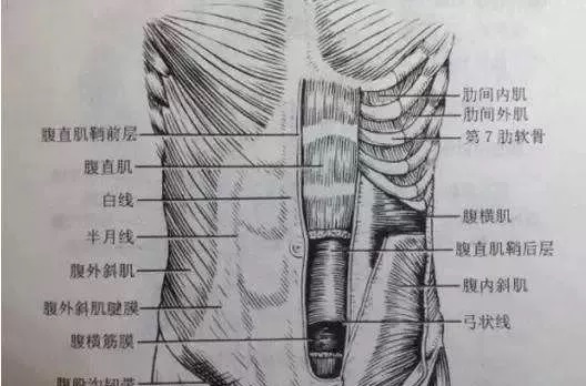 另外一部分为腹外侧壁(腰上部身体两侧),实际上它包含了三层肌。最外层是腹外斜肌,中层是腹内斜肌和最内层为腹横肌。