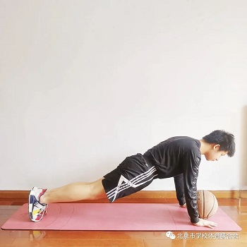 俯卧撑开始,两手中间放置一球,核心发力,保持躯干挺直稳定的状态,两手依次左右拨球,能力允许的同学,可以在拨球之间加做一手支撑地面、一手支撑球的俯卧撑动作。