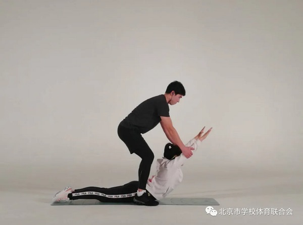 练习者俯卧,帮助者分腿站其身体两侧,扶握住练习者肘部,将其慢慢向上抬起到适当的高度,练习者的躯干前侧有拉伸感,保持姿势。