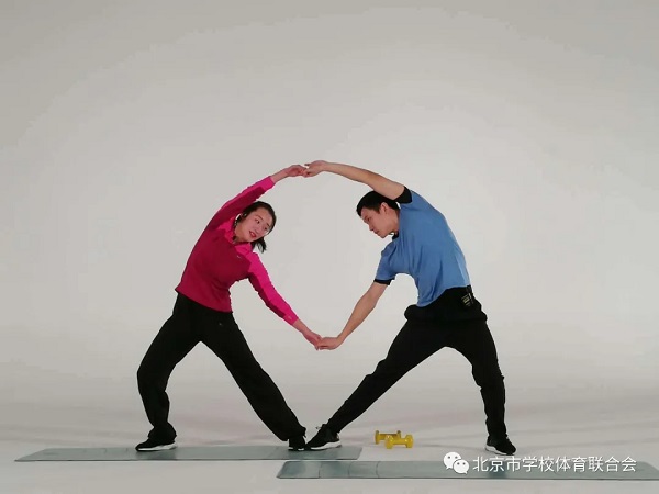 两人并肩、大开立,内侧手相握,外侧手头上相握,手臂伸直,抬头展胸,同时向外成侧弓步,两人外侧躯干有拉伸感,保持姿势。