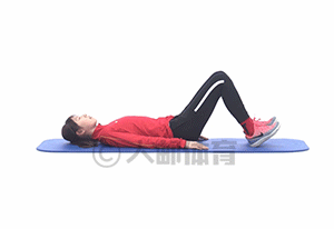 1.身体呈仰卧姿,双腿屈膝,脚尖勾起,脚跟着地, 双手放在身体两侧,自然摆放。