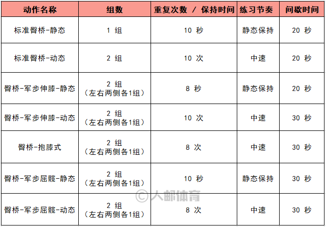 臀桥练习作为臀部训练中的经典动作之一,是锻炼臀部肌肉的极佳训练动作,非常适合孩子们练习。下面为大家介绍的这套臀桥动作模式练习方案不仅能强化青少年臀部肌肉的力量,还能加强大腿后侧的腘绳肌和髋部稳定性,综合提升下肢的力量、爆发力和柔韧性。并且,这套动作在家“躺着”就能练!赶紧让你的孩子练起来~
