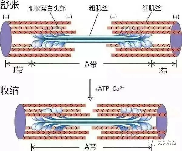 在此,我们知道了肌肉收缩的实质是肌丝的相对滑行。滑行是因为粗肌丝肌球蛋白的横桥结合细肌丝的活性位点,消耗ATP拉动细肌丝向肌节中央M线靠近,此时肌小节缩短,肌肉收缩。