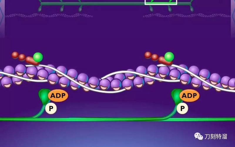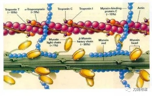 如前所述,肌丝里面有四种蛋白,肌球蛋白、肌动蛋白,原肌球蛋白和肌钙蛋白。肌球和肌动是收缩蛋白,相当于经典爱情故事里面的男女主角。你可以想像她们是梁山伯和祝英台,或者是泰坦尼克号里面的杰克和肉丝。原肌球蛋白是阻碍和保护肌动蛋白的,相当于女主角她妈,平时总是挡着肌动蛋白上面的活性位点,生怕外面哪个恶棍就牵了小手手去了。但所有的结构都应该是半通透的,老妇人再严厉,都得有个结构上的松口,就是这个喜欢收钙离子的爱占便宜的闺蜜或者丫环。