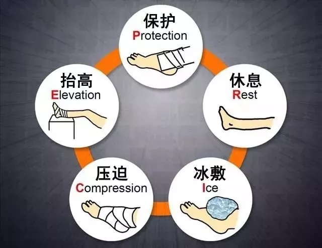 保护固定(Protection)、休息制动(Rest)、冰敷患处(Ice)、加压包扎(Compression)、抬高患肢(Elevation)。